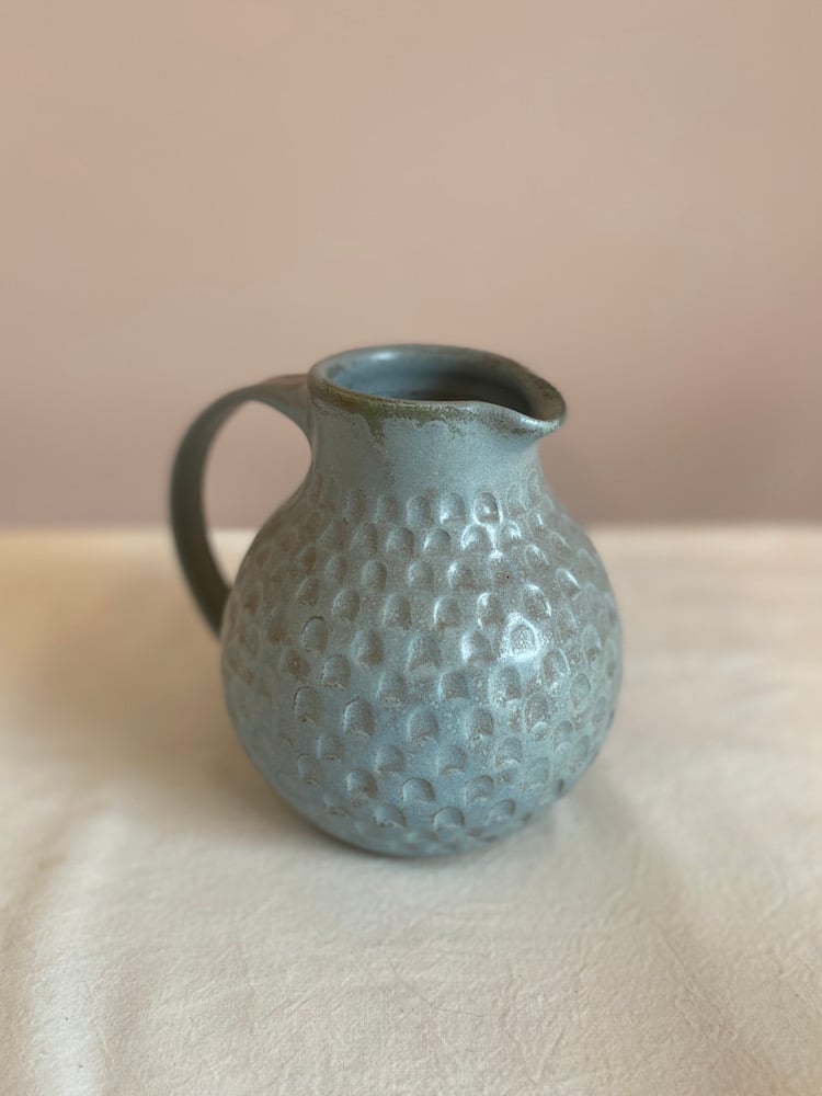 A large carved jug in a satin blue/grey glaze. A perfect water jug or vase.
