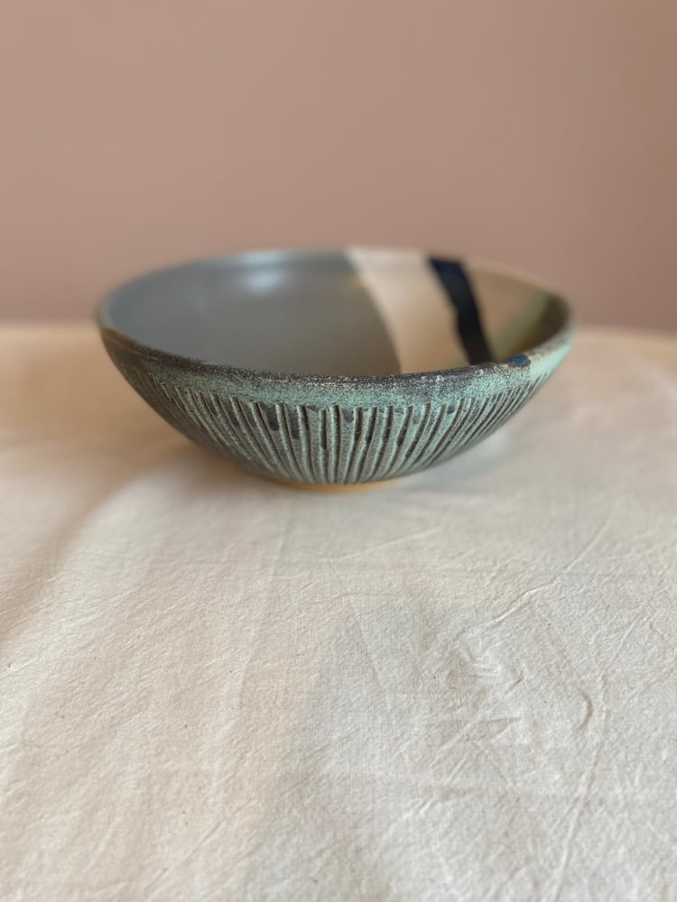 Large bowl in overlapping white, green, grey glaze with a blue stripe. A great serving dish or fruit bowl. Carved on the outside.
